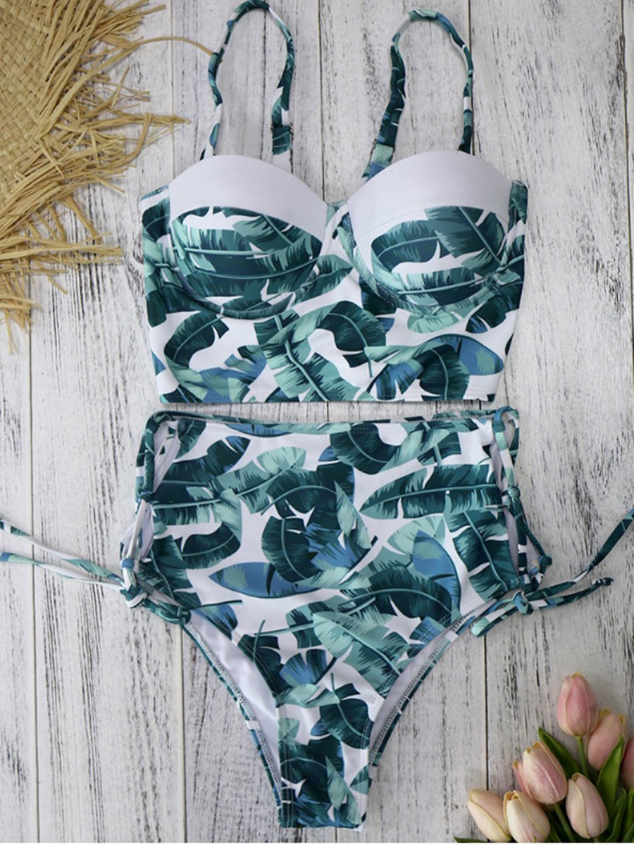 Product: Vintage High Waist Cutout Bikini Tropical Leaf Print Open-back Swimsuit