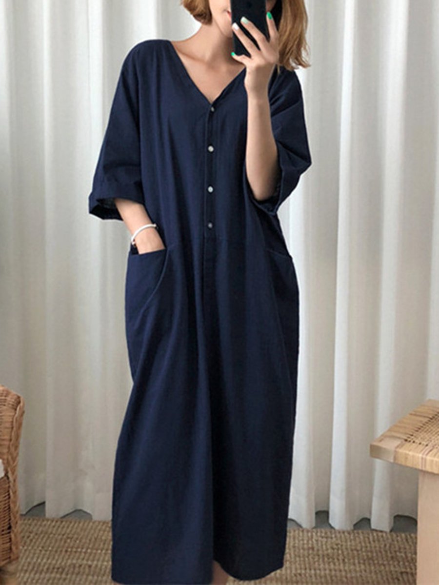 Product: Simple Solid Color V-Neck Slit Loose Cotton Linen Lazy Maxi Dress