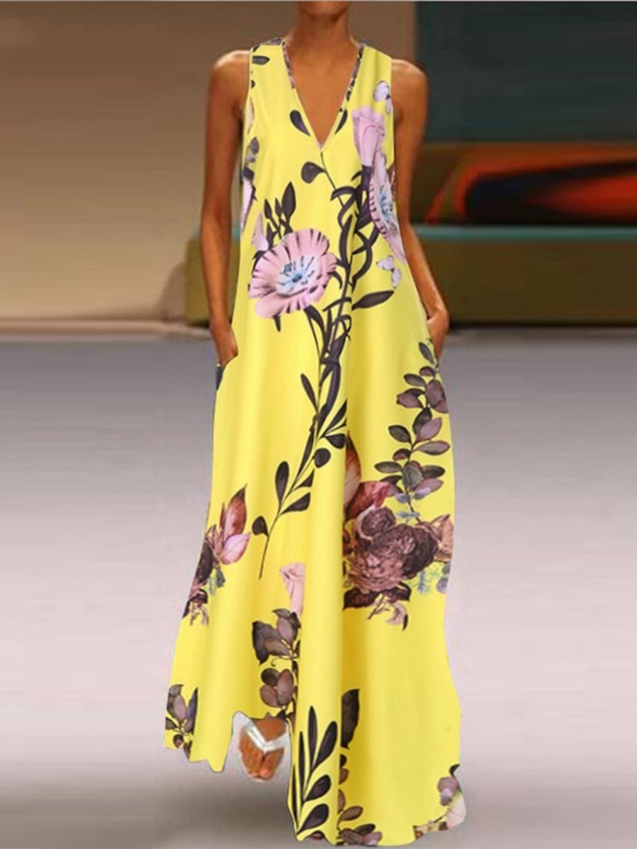 V-neck Sleeveless Print A-line Pocket Maxi Dress